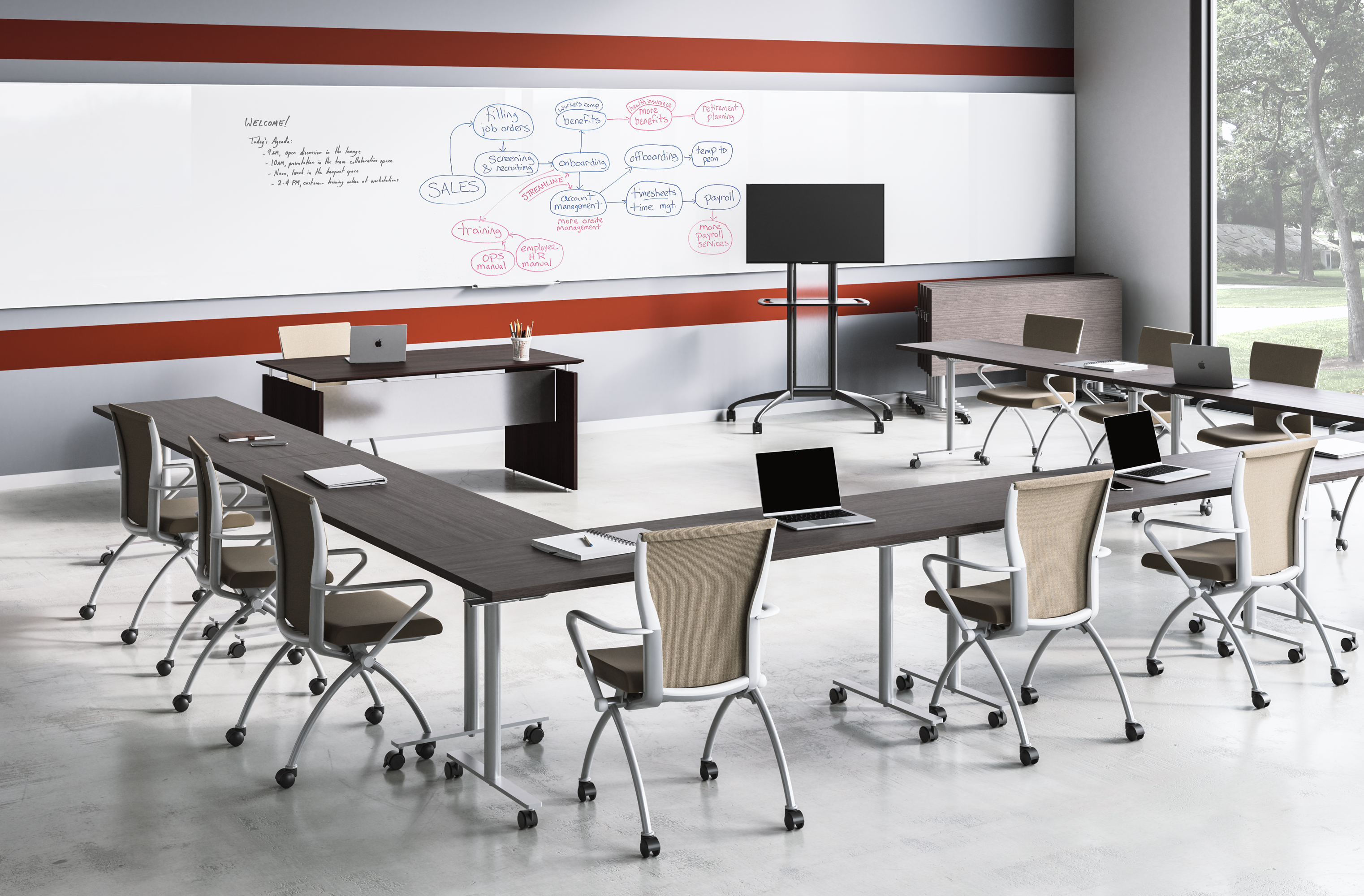 - The nesting capabilities and mobility of the flip table with T-leg base are perfect for classroom and training environments.