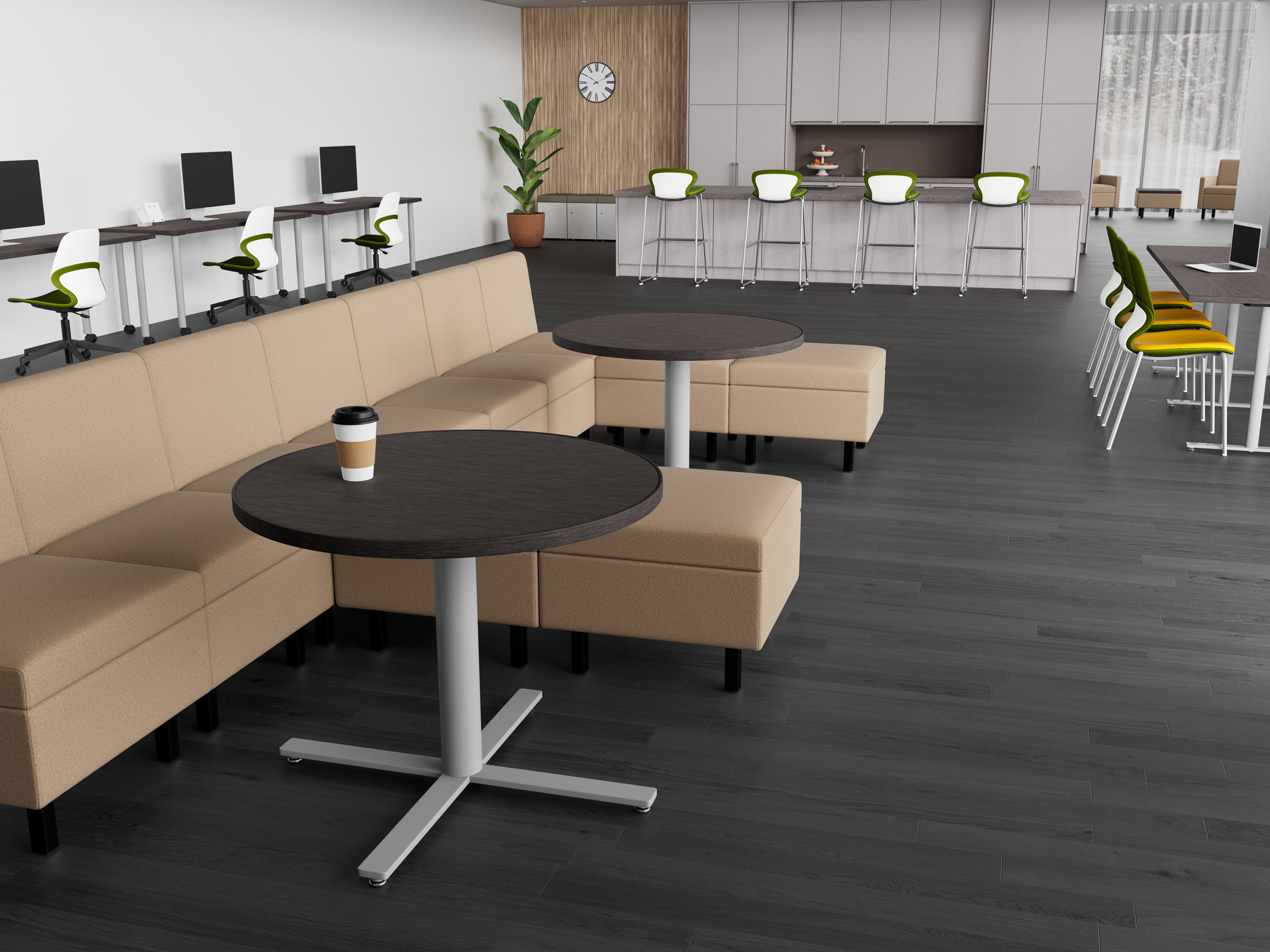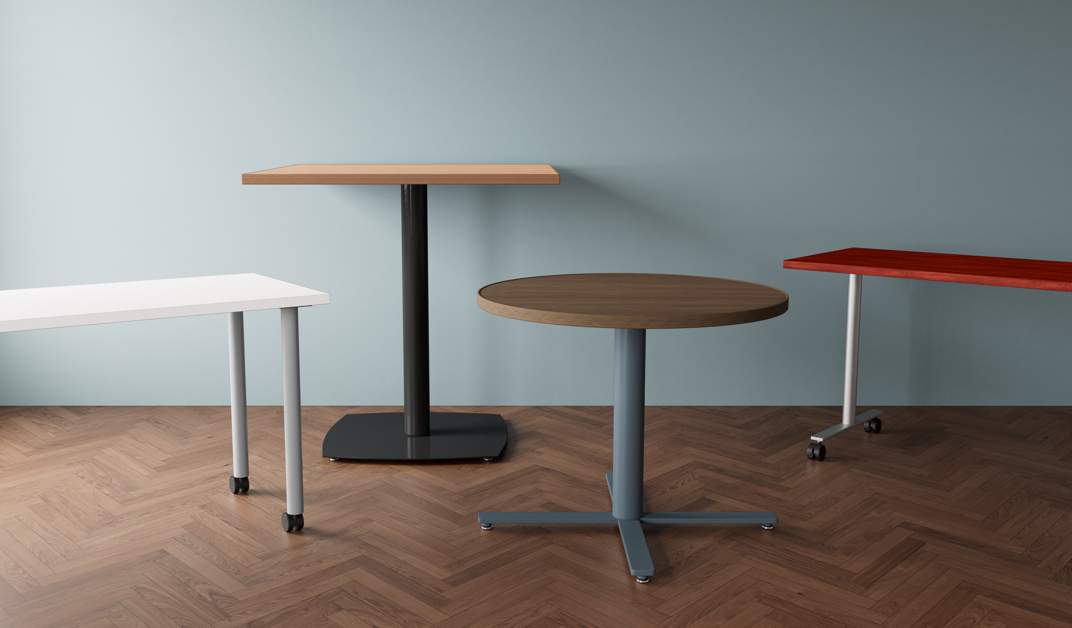 - Available in 15 laminate top colors and 10 powder coat painted leg and base colors.