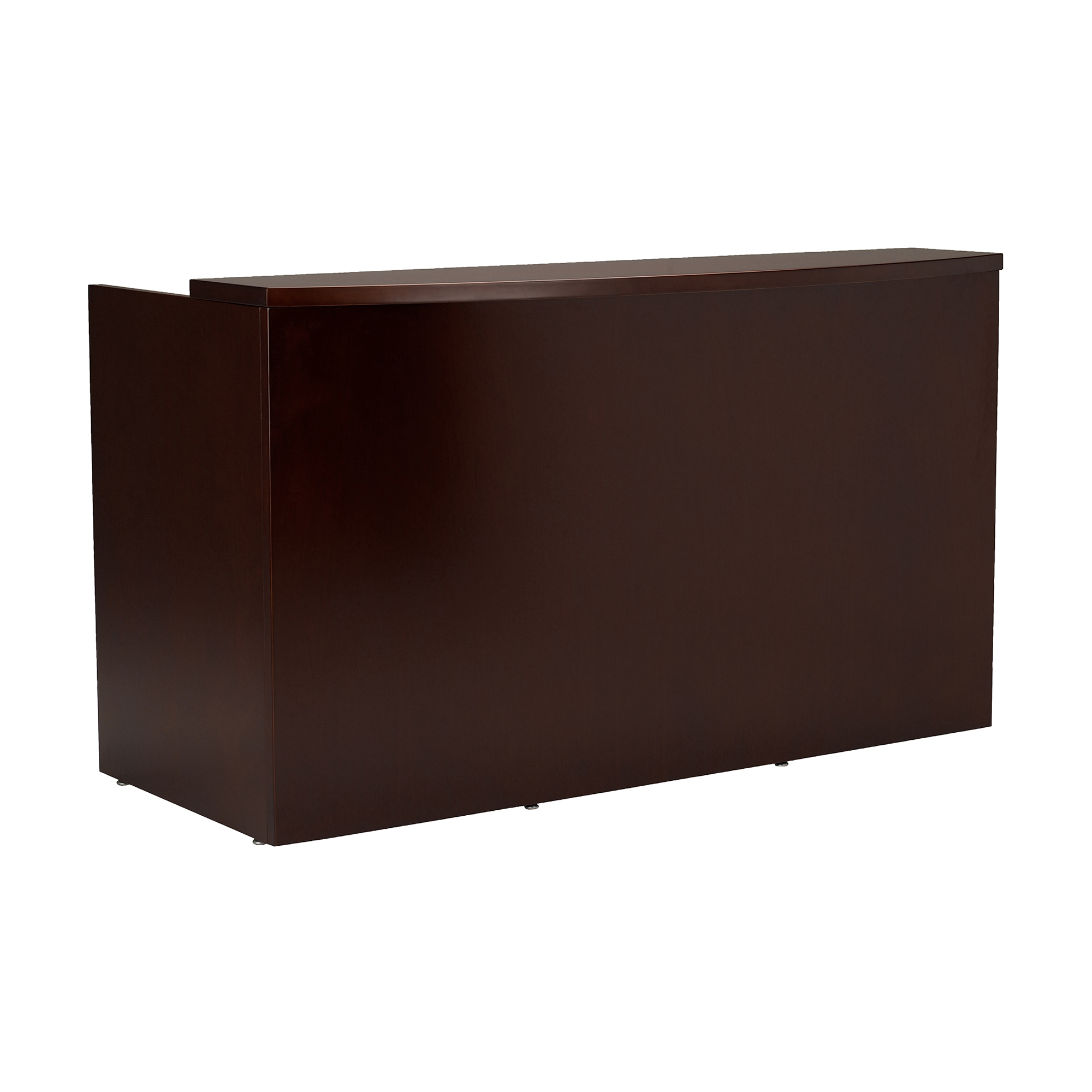 The Mira Series Reception Station is available in Medium Cherry finish on Cherry veneer. All of the Mira Reception Stations (except MRS7278D) include a center drawer. It has non-handed returns and is available in one color. It is configured as either a freestanding double-pedestal desk station, or complete with a non-handed return. An optional glass counter top is available.