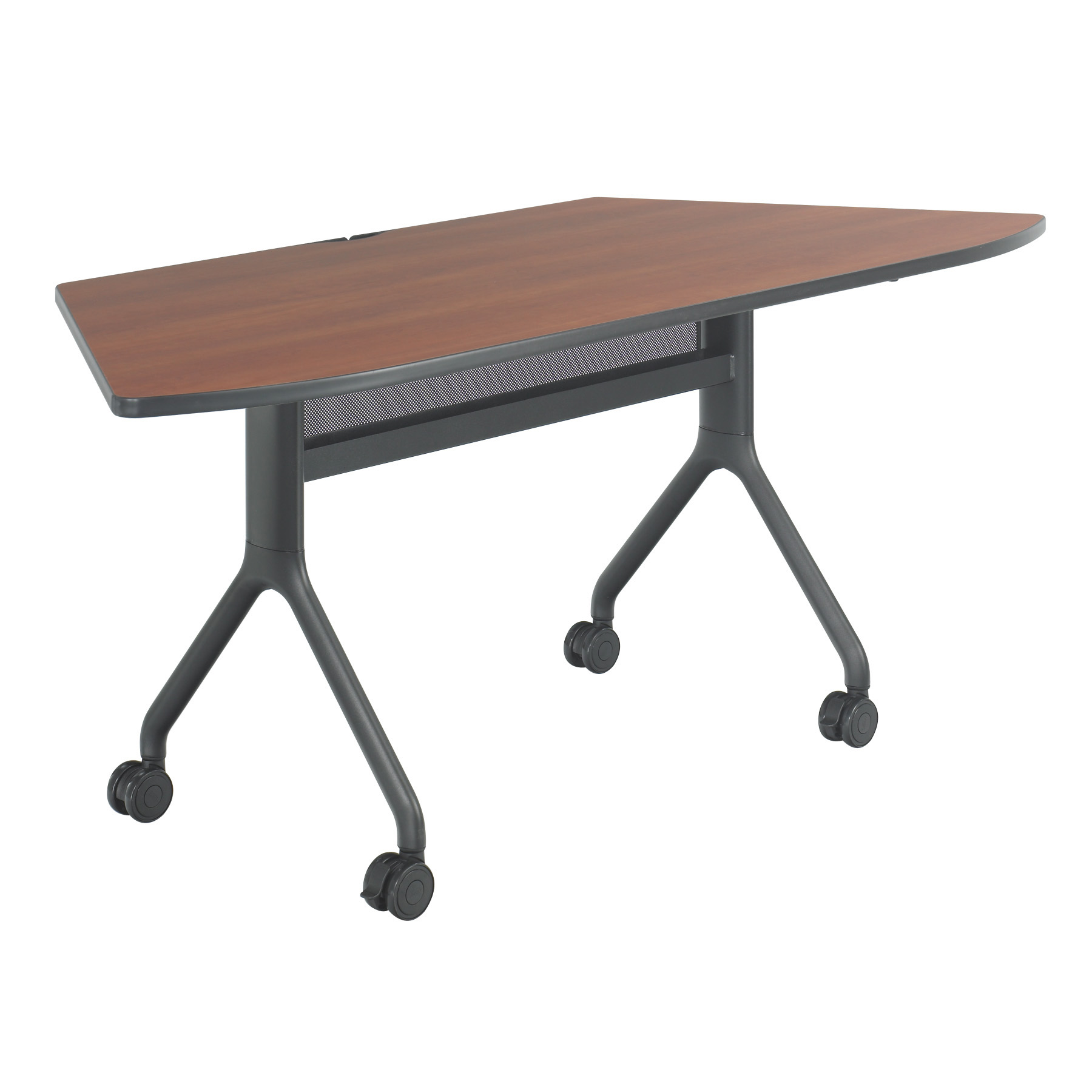 The Rumba™ Trapezoid Table features a flip-down top to easily nest for storage. The tabletop is made from a 1" high-pressure laminate top with 3mm vinyl t-molded edging. The training table offers mobility via dual-wheel casters (two locking) and features a black mesh modesty panel and integrated cable management. The optional ganging connector helps secure tables together quickly. Top measures 72 x 30".